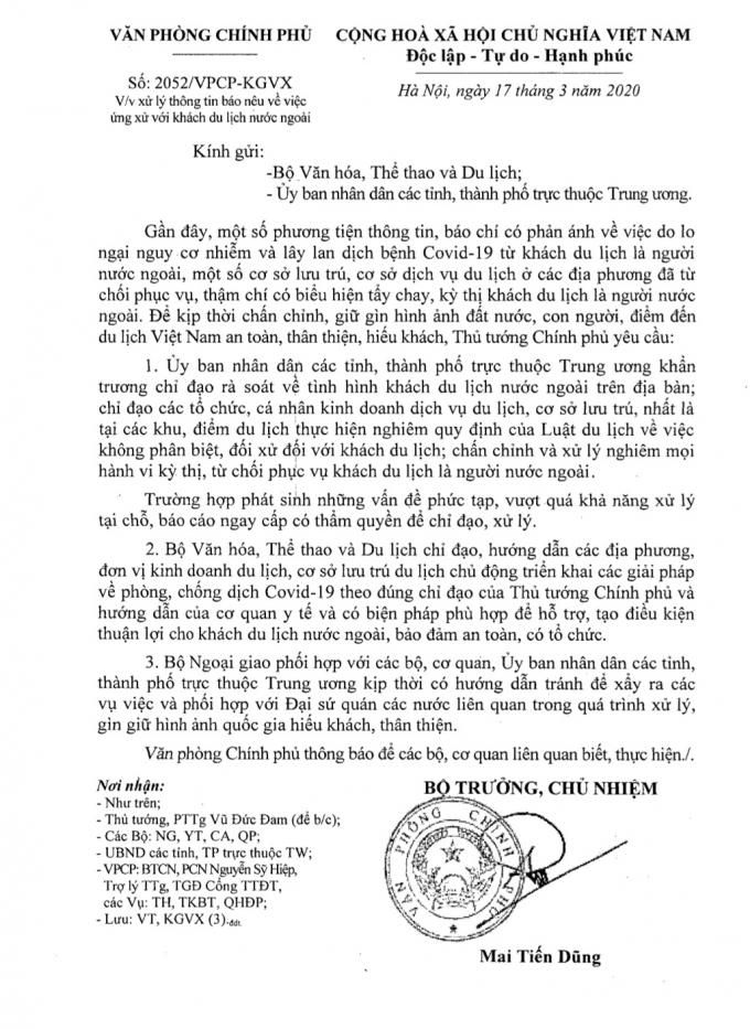 Cũng theo nội dung Công văn, Chính phủ yêu cầu Bộ Văn hóa, Thể thao và Du lịch chỉ đạo, hướng dẫn các địa phương, đơn vị kinh doanh du lịch, cơ sở lưu trú du lịch chủ động triển khai các giải pháp về phòng, chống dịch Covid-19 theo đúng chỉ đạo của Thủ tướng Chính phù và hướng dẫn của cơ quan y tế.