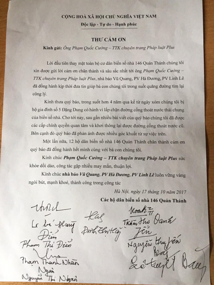 Mới đây, Pháp luật Plus nhận được lá thư cảm ơn từ các hộ dân cùng biển số nhà 146 Quán Thánh. Các hộ dân đã bày tỏ niềm vui, cùng những lời cảm ơn chân thành, sâu sắc đến Tổng thư ký của Pháp luật Plus - Ông Phạm Quốc Cường, cùng các nhà báo, phóng viên: Vũ Quang, Hà Đương, Linh Lê đã đồng hành cùng sự việc.