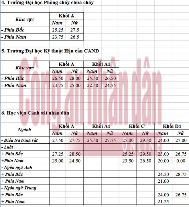 ĐH An ninh Nhân dân tuyển sinh khối A, A1, C và D1 ngành Điều tra trinh sát. Điểm trúng tuyển thí sinh nam đăng ký xét tuyển các khối trên lần lượt là 25 điểm, 24,25 điểm, 23 điểm và 22,5 điểm.