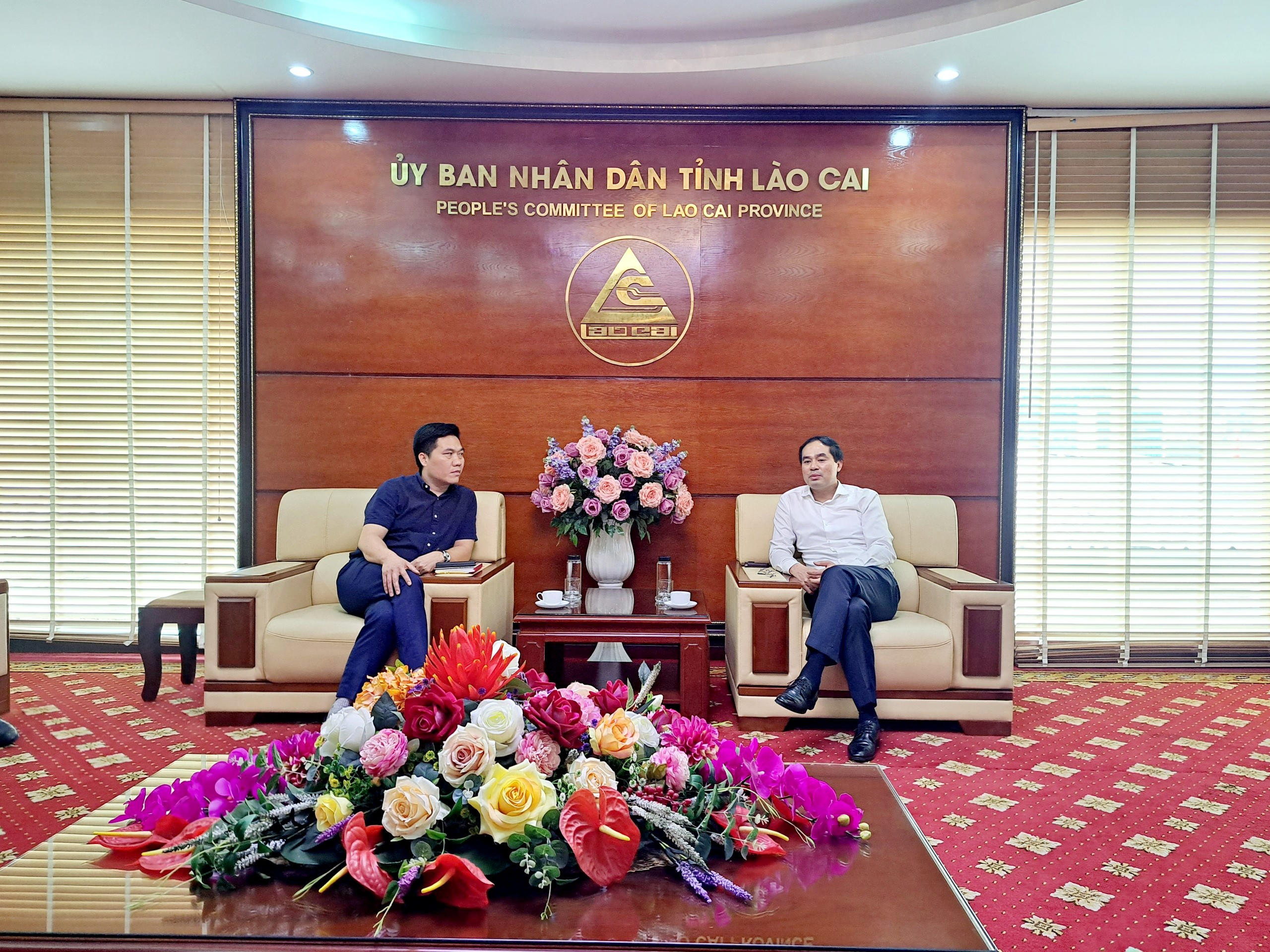 Ông Trịnh Xuân Trường (bên phải), Chủ tịch UBND tỉnh Lào Cai trao đổi với Nhà báo Hoàng Vượng, Trưởng văn phòng đại diện Báo PLVN.