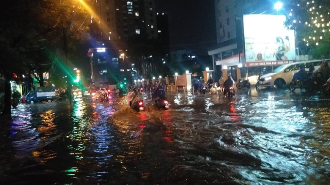 Đoạn đường Nguyễn Phong Sắc ngập lụt sau trận mưa tối 13/6. Ảnh: Chu Phượng