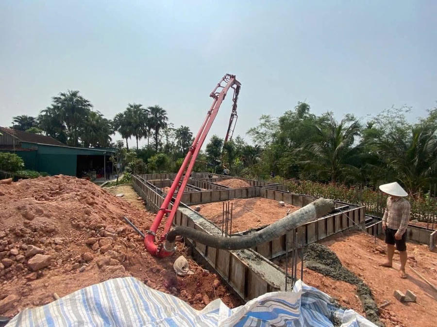 Trong quá trình thi công đổ móng nhà dân tại xã Thạch Xuân (Hà Tĩnh), xe bơm bê tông bất ngờ bị lún trụ, khiến cần bơm đổ nghiêng và va đập mạnh vào khu vực thi công.
