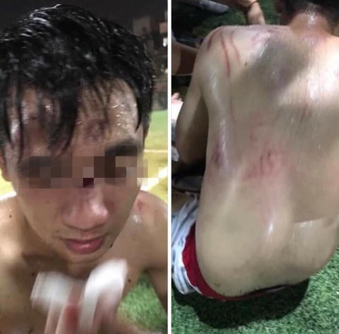 Sau pha va chạm trên sân, nam thanh niên bị nhiều thành viên đội bóng xăm trổ đánh hội đồng rách mũi, bầm mặt và lưng nên phải nhập viện.