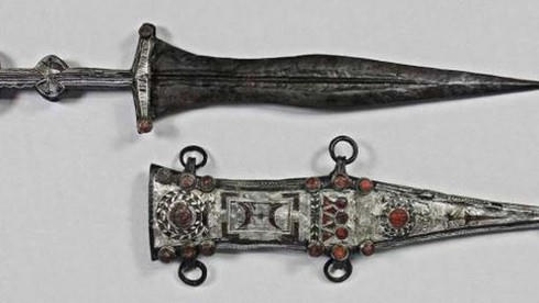 Chiếc dao găm bằng bạc dài khoảng 33 cm đựng bên trong vỏ bọc đẹp mắt. Để khôi phục dao găm bạc cổ xưa, các chuyên gia đã tiến hành chụp X-quang, chụp CT kiểm tra tình trạng cổ vật. Được biết, con dao găm đã bị ăn mòn.
