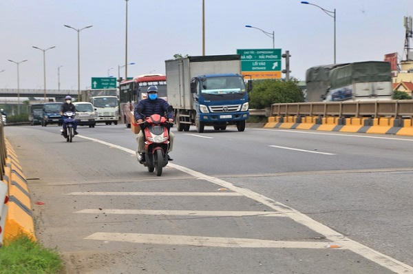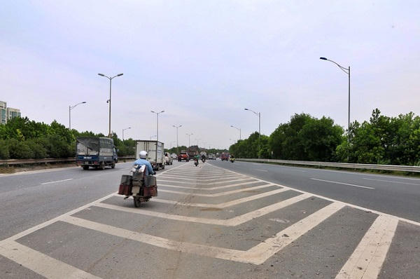 Hai làn đường dành cho xe máy và ô tô được phân rõ bằng vạch liền kéo dài (trong ảnh có thể thấy một đoạn không có vạch kẻ là do mặt đường mới được sửa chữa, vạch sơn đường chưa được kẻ lại).