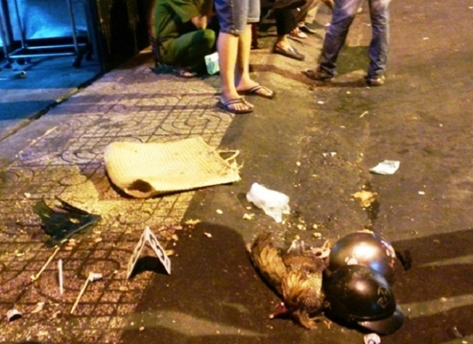 | Nhiều vật chứng trong vụ truy sát tại hiện trường trong đó có một con gà đá. |