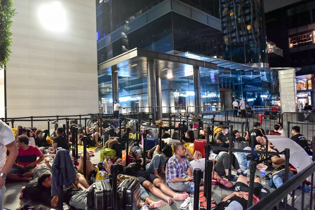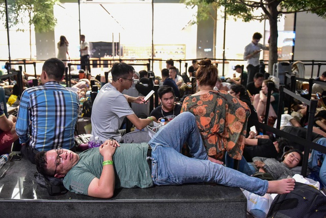 Trong số những người xếp hàng trước cửa Apple Store, có rất đông người đi theo nhóm. Để đảm bảo an toàn, tránh mất mát đồ dùng giá trị, họ thay phiên nhau người ngủ, người trông đồ.