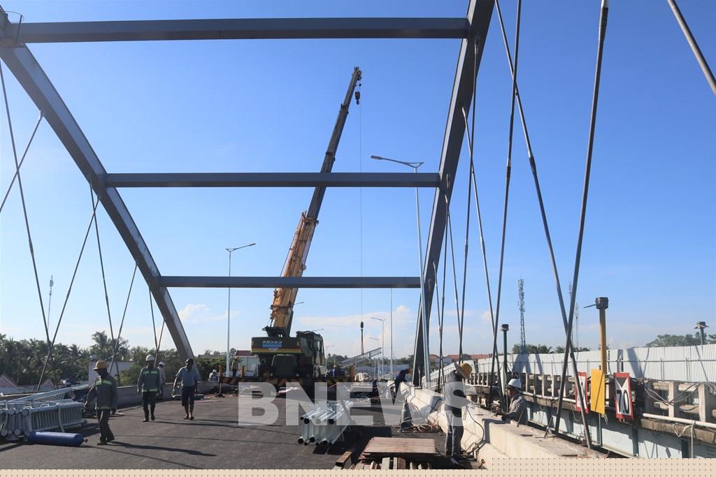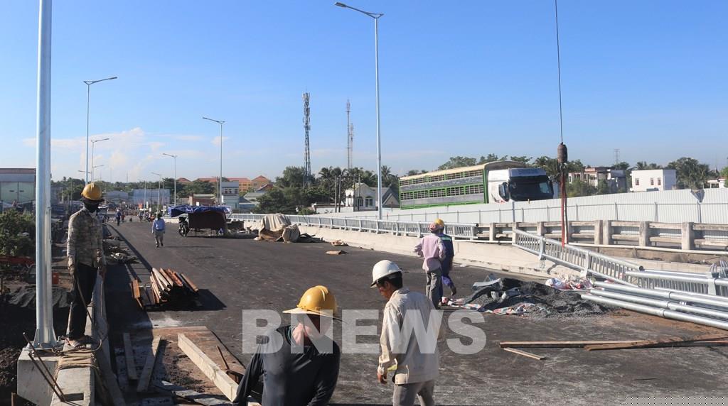Lan can hai đầu cầu, thiết bị chiếu sáng của cầu Măng Thít đang được công nhân khẩn trương hoàn thành. Ảnh: Quang Toàn/BNEWS/TTXVN