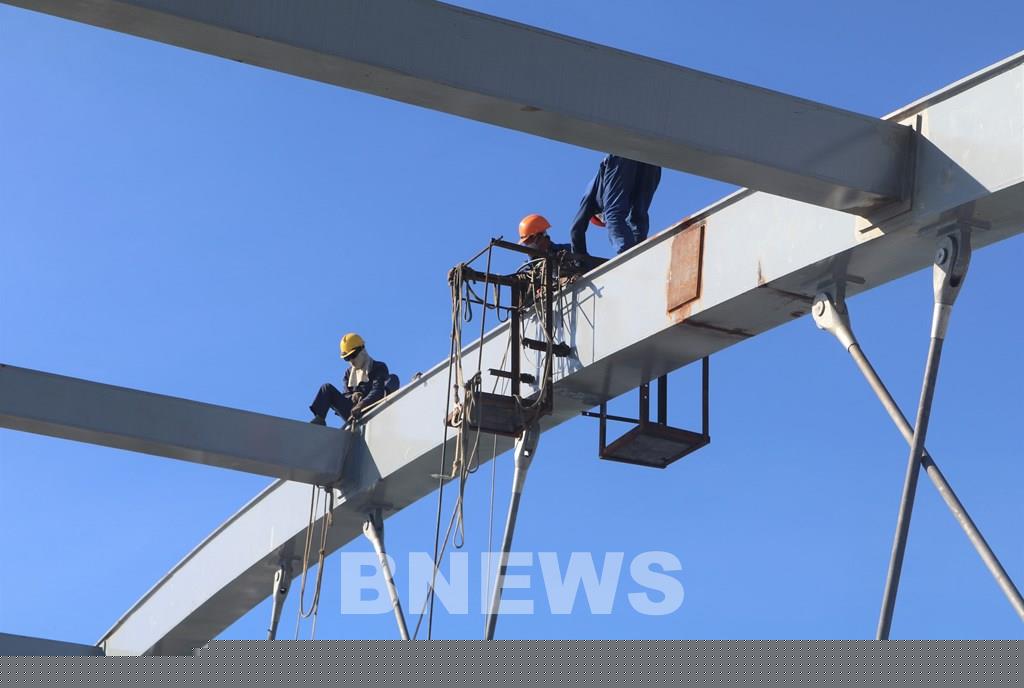 Các công nhân đang hoàn thành các công đoạn cuối củng để chuẩn bị đưa cầu Măng Thít vào khai thác. Ảnh: Quang Toàn/BNEWS/TTXVN
