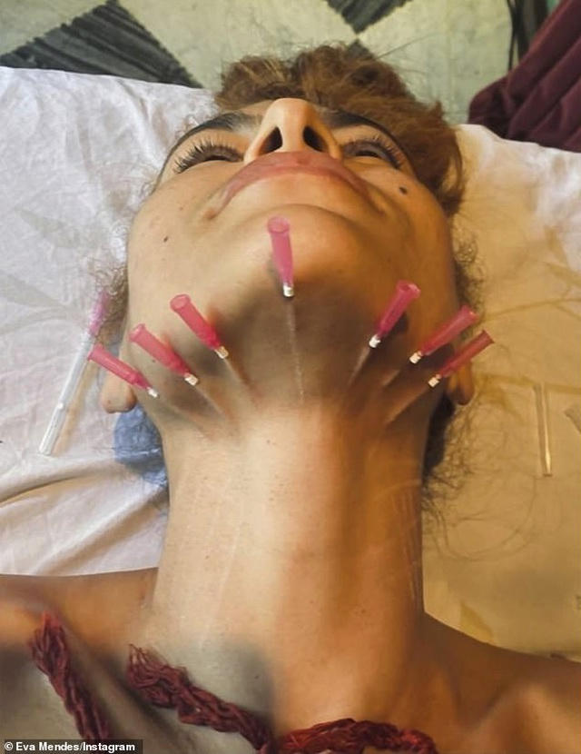 Bức ảnh khiến người xem sửng sốt bởi có tới 7 cây kim đang nằm trên cổ của Eva Mendes. Quá trình căng da mặt này hẳn là bí quyết giúp nữ diễn viên 46 tuổi luôn giữ được vẻ đẹp trẻ trung.