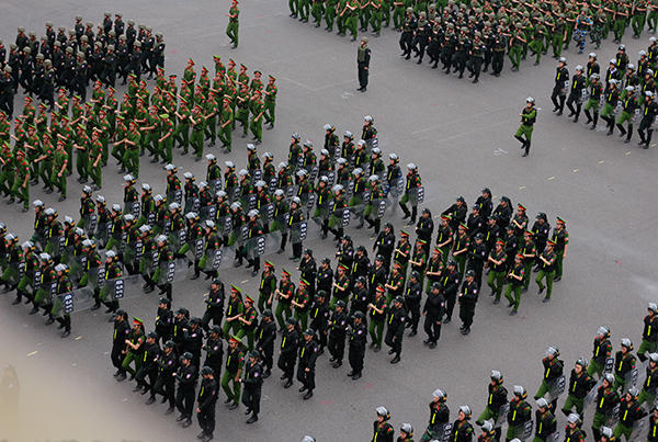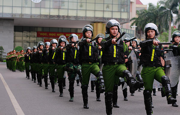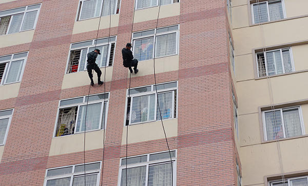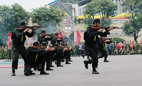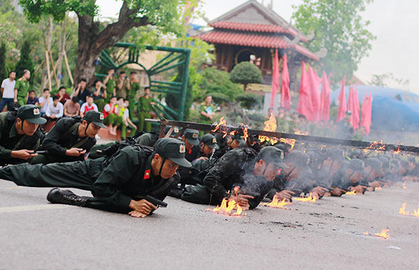 Sinh viên cảnh sát vũ trang trình diễn khả năng leo tường, vượt lửa, chống vũ khí hoá học, giải cứu con tin trong buổi diễn tập lần 1, chuẩn bị cho hội thao chào mừng 49 năm thành lập Học viện Cảnh sát nhân dân.