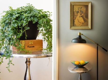 Một điểm cộng dành cho thiết kế căn hộ nhỏ của cặp đôi sống tại New York này chính là sự thông minh khi lựa chọn nội thất, phụ kiện lưu trữ, không chỉ ở phòng khách, bếp, phòng ngủ mà còn ở những chi tiết rất nhỏ. Những chiếc hộp gỗ phong cách vintage cổ điển được cố định trên bức tường vừa làm mục đích lưu trữ chìa khóa, bóp ví,… vừa trang trí nổi bật trên phông nền xanh thẫm. Ngoài ra, những chậu cây cảnh tươi xanh cũng góp phần đem thiên nhiên tươi mát đến gần với căn hộ hơn nữa.