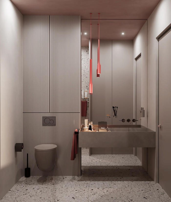 Phòng tắm trong căn hộ trang trí theo phong cách hiện đại, cộng thêm một vài điểm nhấn màu hồng trên đèn và khăn./.