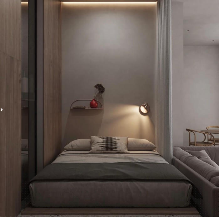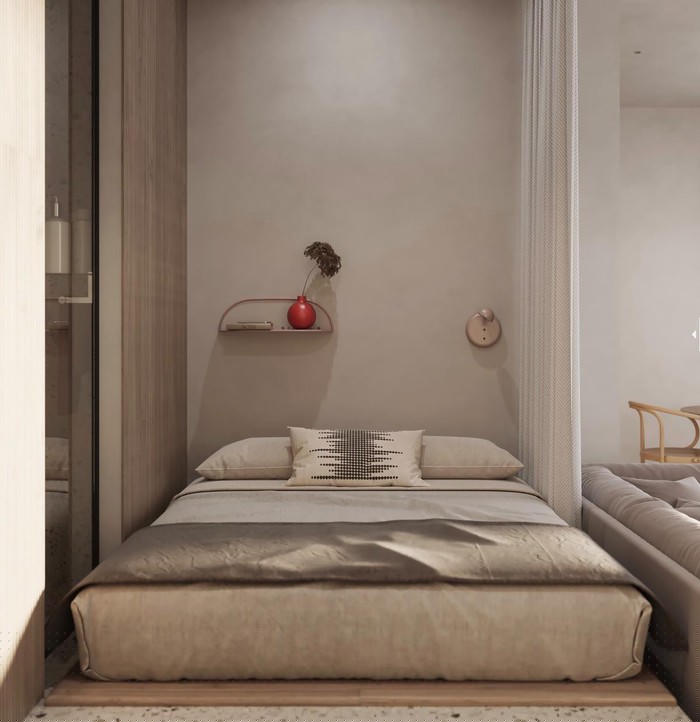 Phòng ngủ nhỏ đặt ngay sau ghế sofa phòng khách. Một tấm màn che đặt ở giữa, đảm bảo sự riêng tư cho chủ nhà.
