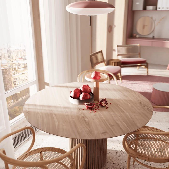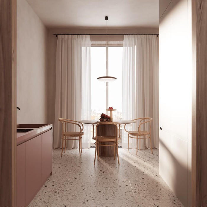 Bên kia bếp, chiếc bàn ăn tròn được bao quanh bởi bốn chiếc ghế ăn.