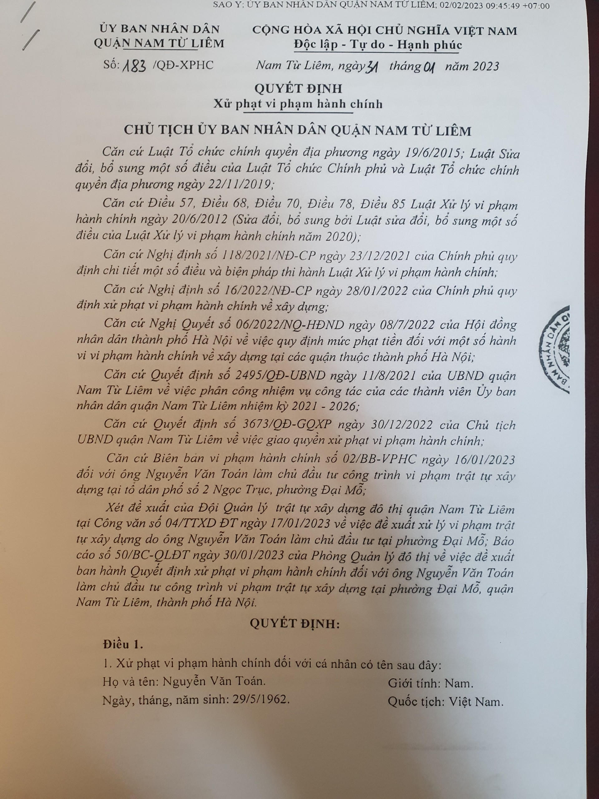 Theo tìm hiểu của PV Báo Pháp luật Việt Nam được biết, ngày 27/3/2023 UBND quận Nam Từ Liêm đã có quyết định số 808/QĐ-CCXP do ông Nguyễn Thanh Bình, Phó chủ tịch UBND quận Nam Từ Liêm ký về việc cưỡng chế bắt buộc thực hiện biện pháp khắc phục hậu quả đối với ông Nguyễn Văn Toán đã có hành vi tổ chức thi công xây dựng công trình sai nội dung giấy phép khi xây dựng sai diện tích tầng tum thành tầng 5 với diện tích 74,0m2, đổ cột và mái tầng 6 với diện tích là 105m2 so với giấy phép xây dựng được cấp. Thời gian thực hiện là 15 ngày kể từ ngày ký quyết định.