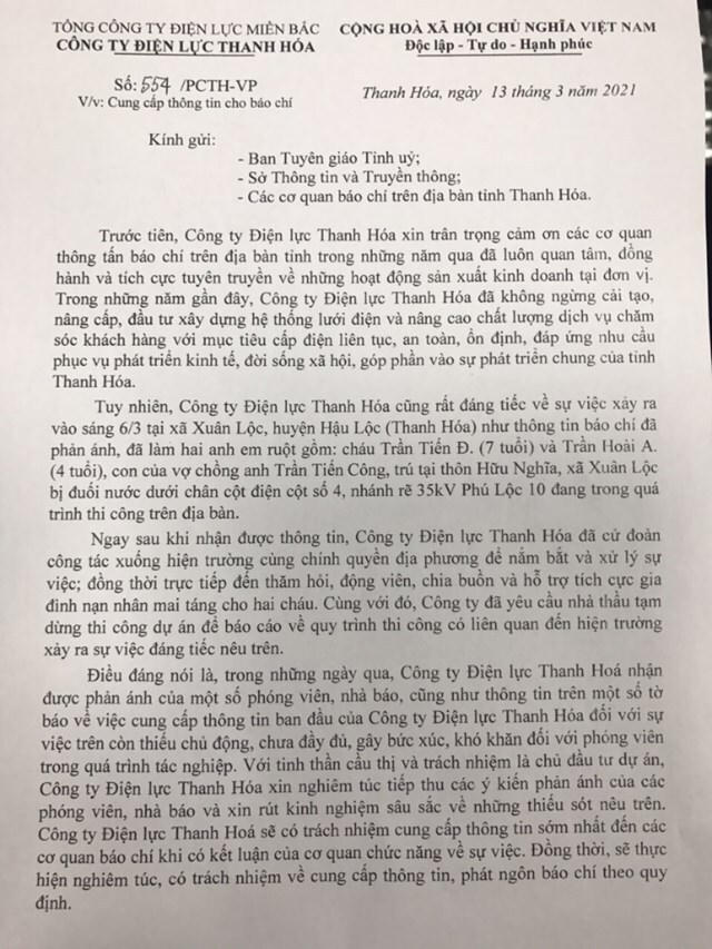Trong văn bản Công ty Điện lực Thanh Hoá cho biết, đơn vị nhận được phản ánh của một số PV, nhà báo, cũng như thông tin trên một số tờ báo về việc cung cấp thông tin ban đầu của Công ty Điện lực Thanh Hóa đối với sự việc trên còn thiếu chủ động, chưa đầy đủ, gây bức xúc, khó khăn đối với phóng viên trong quá trình tác nghiệp.