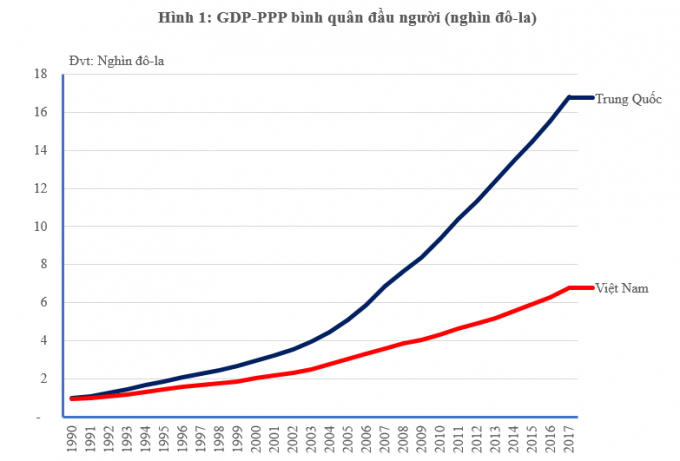 Theo số liệu của Ngân hàng thế giới, GDP bình quân đầu người tính theo ngang bằng sức mua (PPP) vào năm 1990 của Việt Nam và Trung Quốc lần lượt là 987 đô-la và 939 đô-la Mỹ; nhưng đến năm 2017, hai con số lần lượt là 16.807 đô-la và 6.776 đô-la. Năm 1990, hai nước tương đương, nhưng đến năm 2017, Trung Quốc đã cao hơn 2,5 lần (Hình 1). Đáng ra, Việt Nam đã có thể tăng trưởng cao hơn do quy mô nền kinh tế nhỏ hơn có thể tạo quán tính nhanh hơn.
