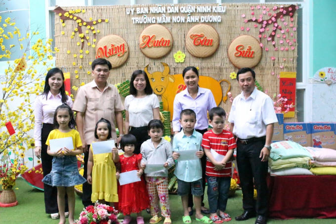 Ông Trần Huy (Trưởng Văn phòng đại diện Hội An toàn giao thôngViệt Nam tại TP Cần Thơ) trao quà cho tết cho các em gia đình có hoàn cảnh khókhăn tại trường Mần non Ánh Dương.