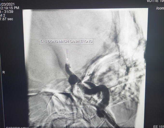 Trên hình ảnh CTscan não cho thấy vùng hoạt tử não chưa nhiều, khả năng vẫn còn có thể cứu được vùng não xung quanh vùng hoạt tử. Hình ảnh CTscan mạch máu não cho thấy mạch máu bị cục máu đông gây tắc từ động mạch cảnh trong trái đoạn ngoài sọ đến động mạch não giữa trong sọ. Ê kíp vẫn quyết định can thiệp cho bệnh nhân sau khi đã đánh giá lợi ích và nguy cơ.