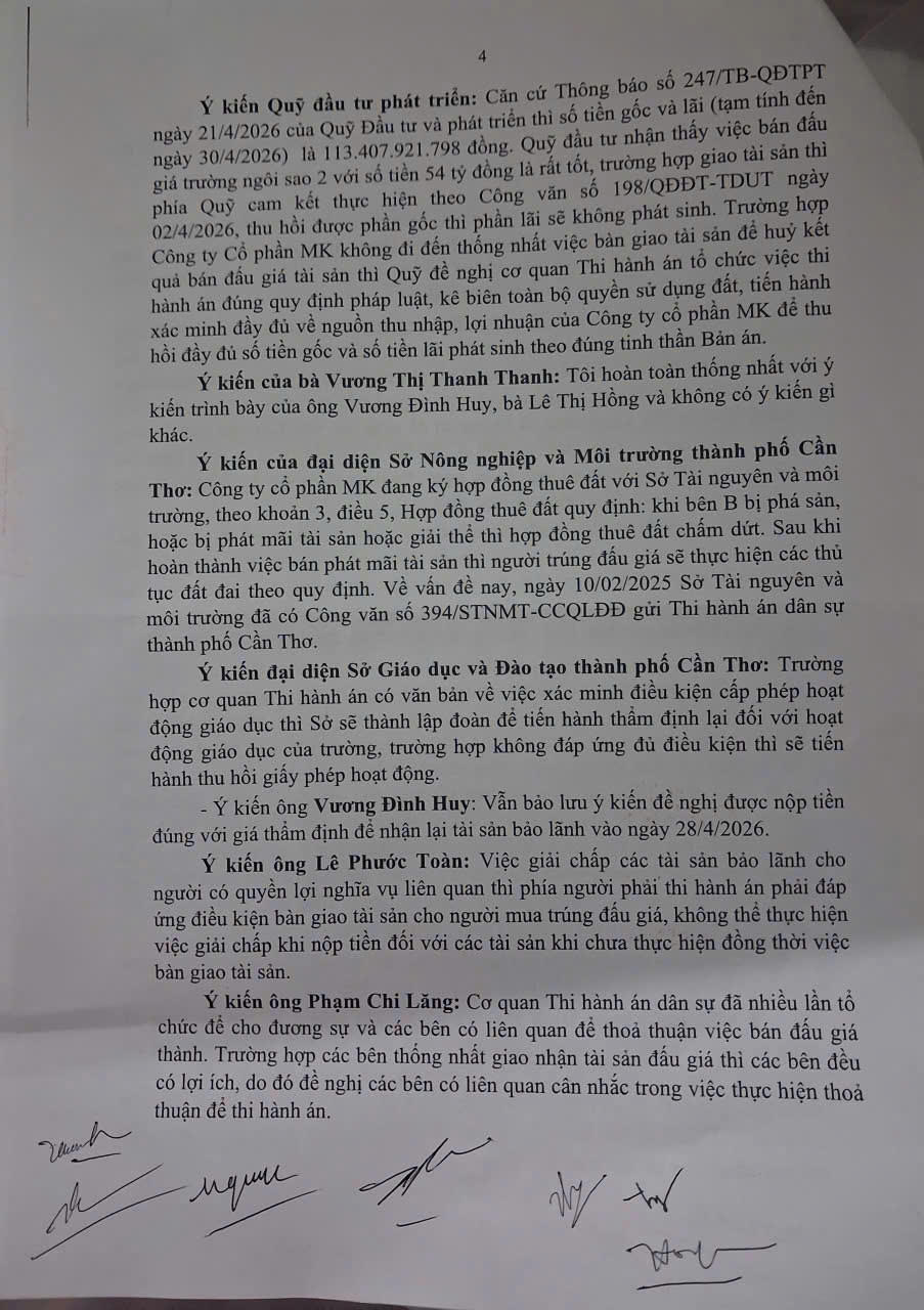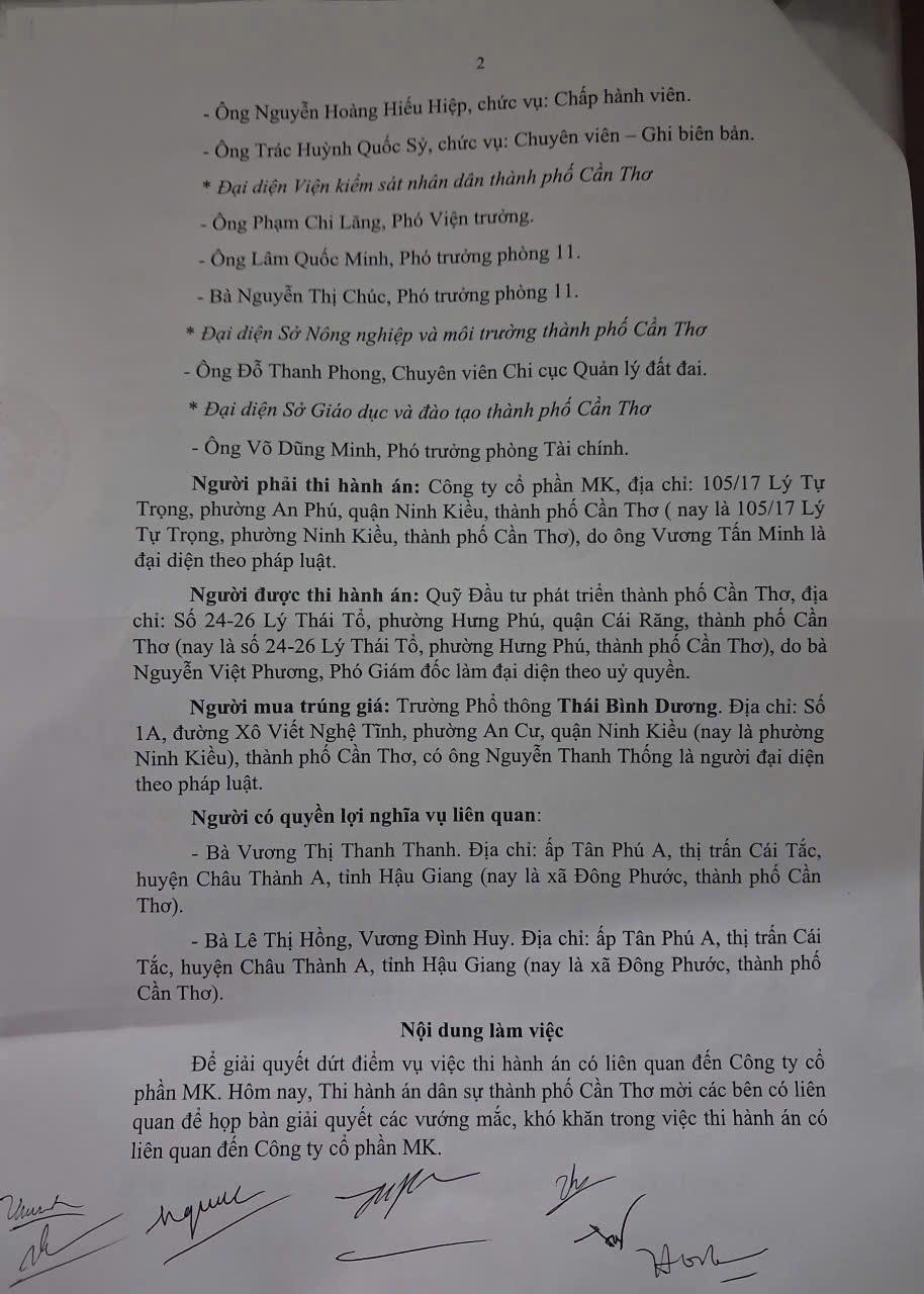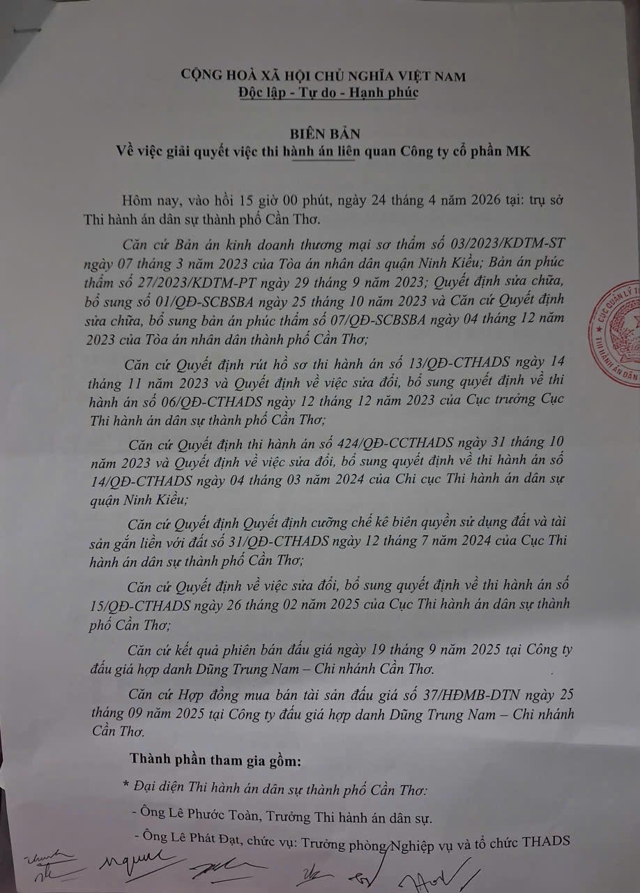 Tại cuộc họp, ông Lê Phát Đạt – Trưởng phòng Nghiệp vụ và tổ chức THADS (THADS TP Cần Thơ) cho biết, vụ việc thi hành án liên quan đến Cty MK các bên đã đi đến thống nhất về những điều khoản đưa ra để thực hiện bàn giao tài sản. Tuy nhiên, đến ngày 14/4/2026, đoàn liên ngành đến chứng kiến việc bàn giao thì phía Cty MK không có mặt và không đồng ý bàn giao tài sản.