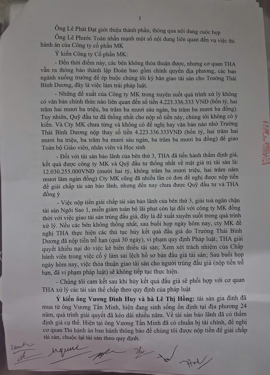Theo ông Đạt, trong quá trình xử lý vụ việc, Cty MK có dấu hiệu cản trở, “cố tình kéo dài thi hành án” trong khi bên trúng đấu giá và bên được thi hành án rất thiện chí thương lượng. Nếu không thống nhất thỏa thuận thì cần thiết THADS sẽ kê biên toàn bộ tài sản liên quan Cty MK trong đó có những tài sản của các hộ dân khác do ông Vương Tấn Minh (Giám đốc Cty MK) đứng tên.