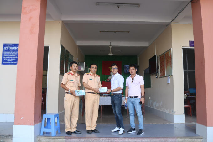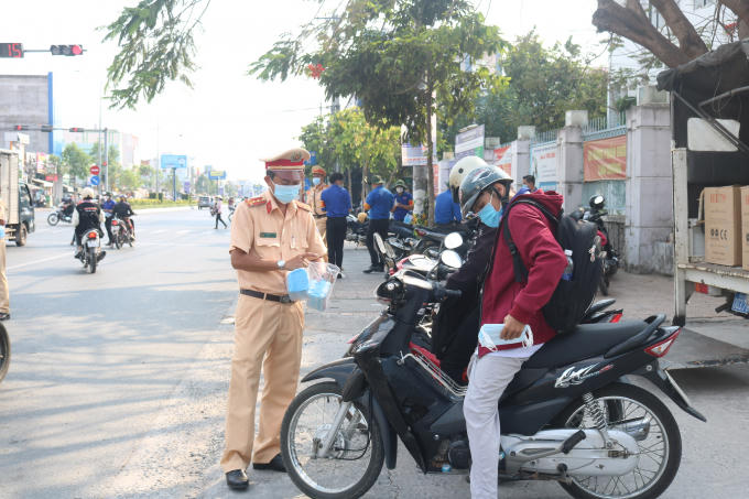Cảnh sát giao thông trao tặng những chiếc khẩu trang cho người dân khi tham gia giao thông.
