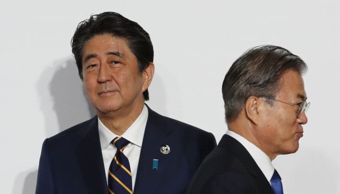 Thủ tướng Nhật Bản Shinzo Abe (trái) và Tổng thống Hàn Quốc Moon Jae-in tại hội nghị thượng đỉnh khối G20 ở Osaka Nhật Bản hôm 29-30/6 - Ảnh: Getty/CNBC.