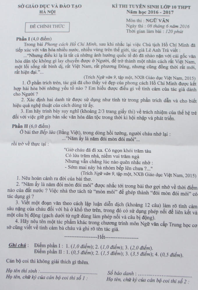 Đúng 10h sáng nay, gần 80.000 thí sinh tham gia kỳ thi tuyển sinh lớp 10 năm 2016 - 2017 đã hoàn thành bài thi Ngữ Văn trong vòng 120 phút.