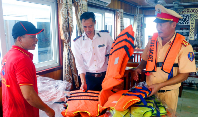 Lực lượng chức năng kiểm tra trang thiết bị cứu sinh trước lúc tàu rời cảng.