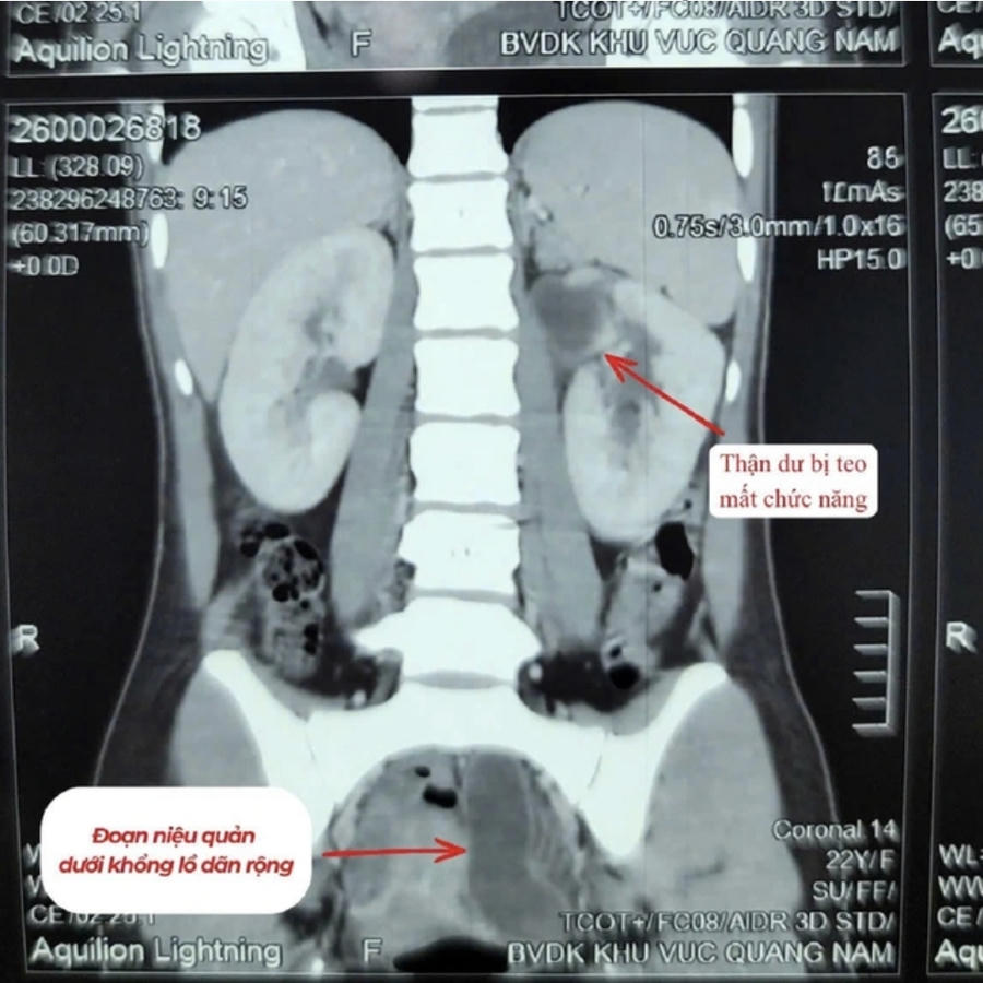 Qua thăm khám và xét nghiệm, bác sĩ xác định người bệnh có hai thận bên trái (tổng cộng 3 thận), trong đó một thận đã mất chức năng, niệu quản giãn lớn và chứa nhiều mủ – nguyên nhân gây nhiễm trùng nghiêm trọng.
