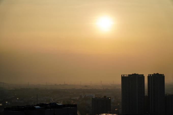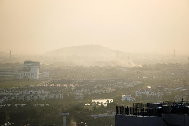 Bầu trời Hà Nội bị che phủ một lớp sương mù trắng không tan dưới ánh nắng chiều.