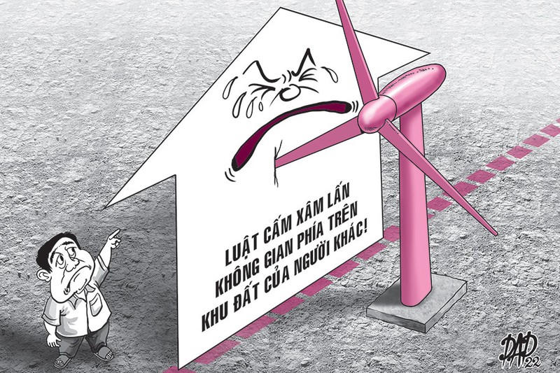 Chủ đầu tư lắp cánh quạt gió ló qua đất của dân là vi phạm pháp luật nên cần thiện chí trong thương lượng bồi thường, nếu người dân không đồng ý với mức bồi thường thì có thể khởi kiện ra tòa.