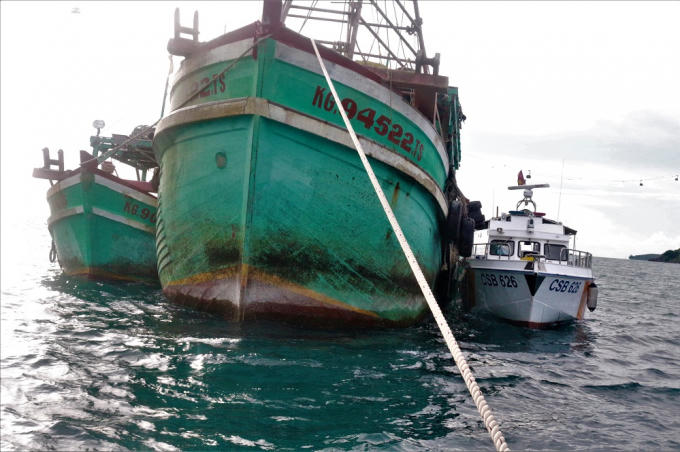 Bộ Tư lệnh Cảnh sát biển dẫn giải 2 tàu vi phạm về vị trí neo đậu an toàn, tiếp tục xử lý theo quy định của pháp luật. (Ảnh: Thanh Hải)