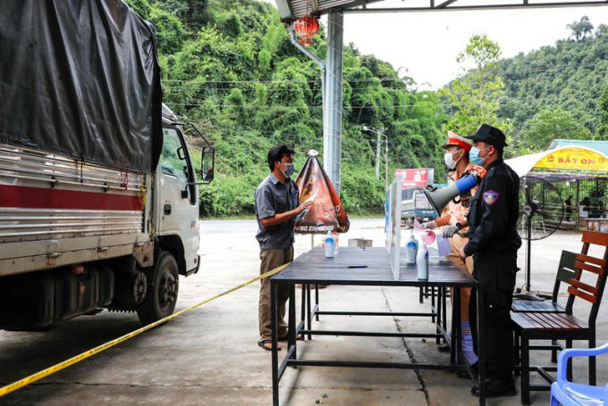 Các lái xe làm thủ tục tại chốt kiểm soát dịch ở trạm dừng chân Đôi Dép.