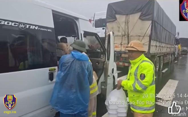 Cảnh sát giao thông phát cơm, nước uống cho lái xe bị kẹt lại trên đường do mưa bão