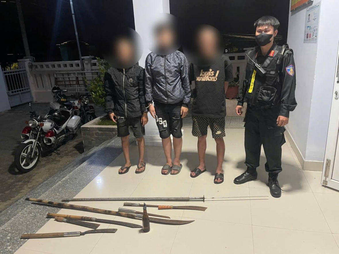Phát hiện thấy Tổ tuần tra, nhóm thanh niên lập tức bỏ chạy. Vì số lượng đối tượng đông, mang theo nhiều hung khí buộc các chiến sĩ đang làm nhiệm vụ phải nổ súng cảnh cáo, tiến hành trấn áp, khống chế, bắt giữ được 3 đối tượng gồm: Đ.A.K (SN 2009, trú xã Phước Thuận, huyện Ninh Phước), N.N.Q.T (trú phường Phủ Hà) và V.T.T.Đ (đều SN 2011, trú phường Đô Vinh).