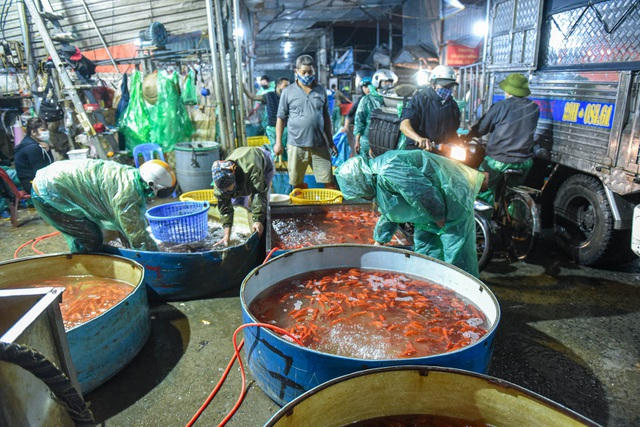 Theo một người bán tại chợ cho biết, năm nay lượng cá chép bán được nhiều hơn năm ngoái, giá bán buôn đối với cá vàng cam dao động 60.000-700.000 đồng/kg; cá đỏ khoảng 80.000-100.000 đồng/kg