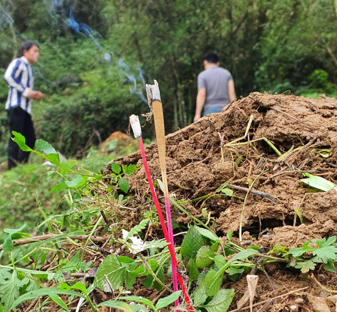 Sau khi xong tất cả mọi việc, từng ngôi mộ sẽ được con cháu đặt lên một cành cây dài khoảng hơn 1 mét để ngày hôm sau sẽ treo lên đó một ít tiền giấy.