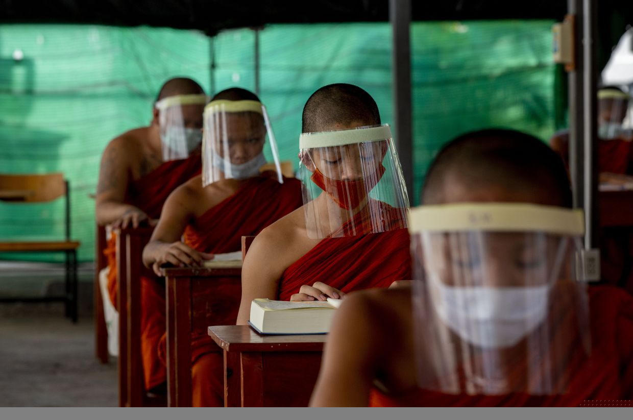 Những chú tiểu tại Thái Lan đeo khẩu trang và mặt nạ nhựa phòng sự lây lan của virus. (Nguồn: AP)