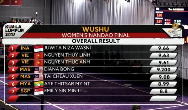 Ở nội dung Nam côn và Nam đao nữ, Nguyễn Thùy Linh đã đạt tổng cộng 19,25 để giành HCB. HCĐ cũng thuộc về một VĐV Viêt Nam khác là Nguyễn Thục Anh. VĐV người Indonesia giành HCV.