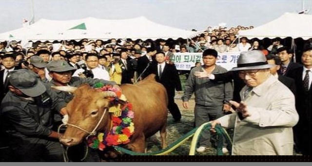 Đó là một trong 1.001 con bò được Chung Ju Yung tặng nông dân làng Asan - nơi ông sinh ra và lớn lên. Một trong những dự án chính của Ju Yung trong chuyến đi trên là thương nghị với Chính phủ Bình Nhưỡng về công trình khu du lịch tại núi Keumgang thuộc địa phận của Triều Tiên. Tuy nhiên, vào ngày 21/3/2001, Chung Ju Yung đã mất trước khi toàn bộ công trình hoàn thành...