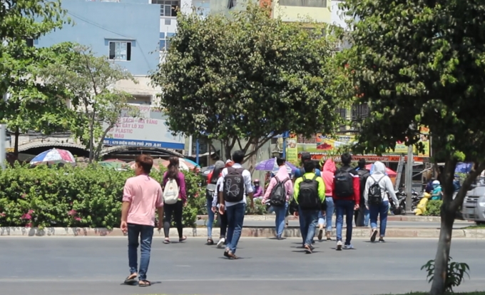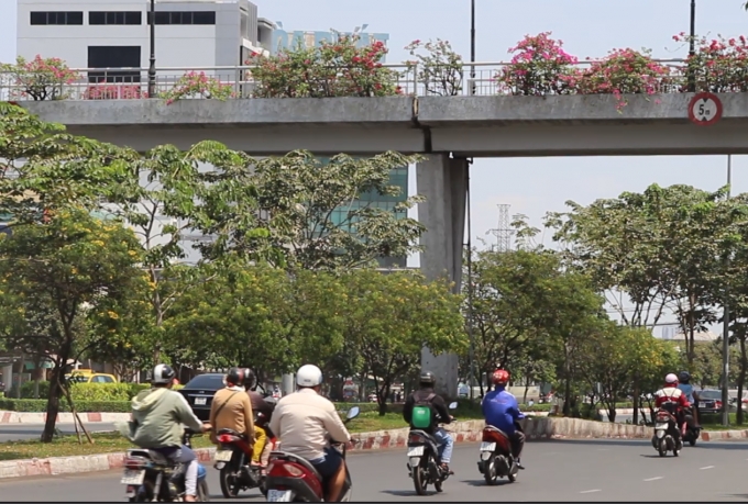 Trong khi đó, trước cổng trường Đại Học Hutech ( quận Bình Thạnh ) thì sinh viên không có cầu bộ hành để đi nên cứ băng ngang qua đường để vào trường. Hình ảnh này diễn ra hằng ngày trong khi lượng xe máy và ô tô qua lại liên tục.