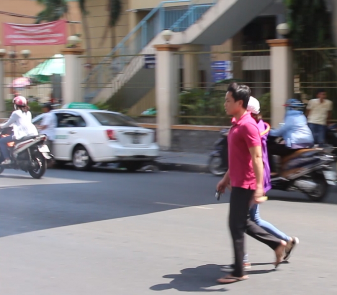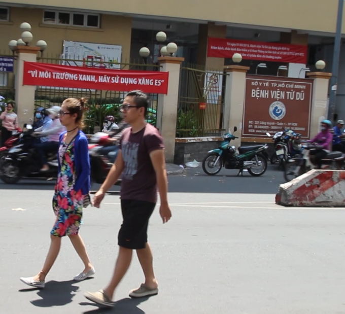 | Cứ thản nhiên đi mặc dù cầu bộ hành có không dùng (Ảnh ghi nhận trước cổng viện Từ Dũ). |