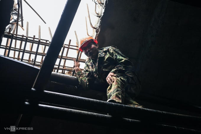 Công nhân Nguyễn Văn Thới, 32 tuổi, trèo trên dây cáp trong lòng cầu để đi lại, căn chỉnh. Anh từ Nam Định lên Sa Pa xây dựng cầu Móng Sến đã gần một năm. "Trên này rừng núi, điều kiện rất khó khăn. Mùa đông có đợt xuống dưới 0 độ C, tôi mặc ba áo vẫn lạnh cóng", anh Thới kể.