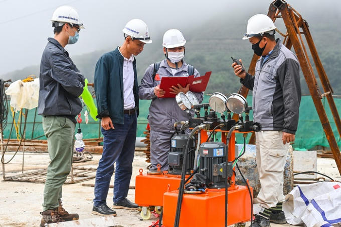 Nhóm kỹ sư tham chiếu các thông số với máy đo. Một người dùng bộ đàm để thông báo cho công nhân kéo cáp bên trong lòng cầu.