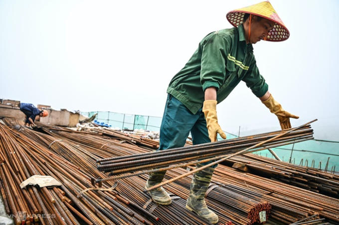 Nhóm công nhân khác đang thu dọn sắt, cốp pha sau khi phần việc xây dựng bê tông hoàn thành.