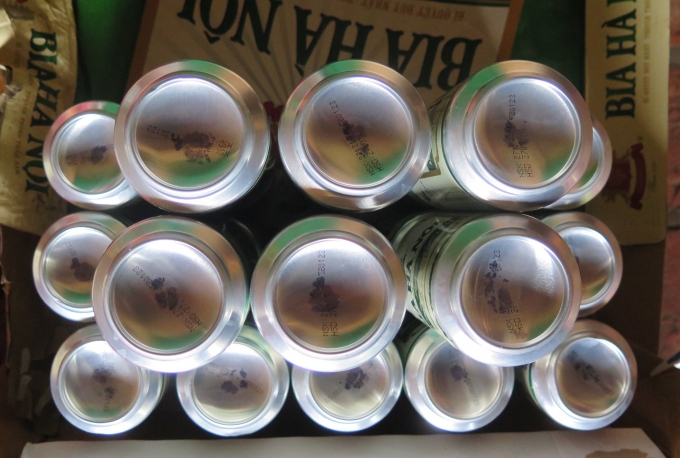Tại hiện trường đã đếm được 325 lon Bia Hà Nội nhãn xanh loại 330ml bị chấm đen ngay vị trí ghi ngày sản xuất và hạn sử dụng, trong đó có 185 vỏ và 140 lon chưa mở nắp.
