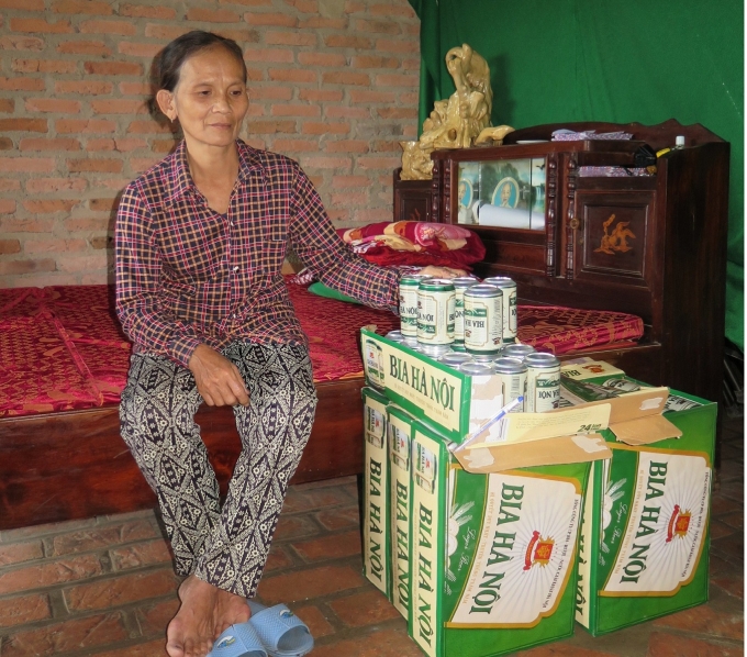 | Bà Liễu bên những chai bia lỗi được gom lại. (Ảnh: Văn Hoàng) |