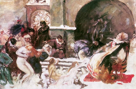 Sau đó, nữ bá tước khoan khoái bước vào bồn tắm để làn da toàn thân được cái chết của các trinh nữ làm cho trẻ lại.